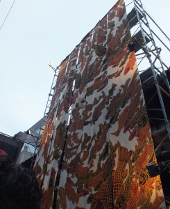 創業270年の老舗帯問屋 誉田屋源兵衛(こんだやげんべえ)さんが 毎年飾られる270(+α)匹の「昇り鯉図」の幟(のぼり)です。 毎年金色の鯉が1匹増えています。来年はぜひ数えてみてください。