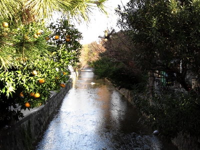 写真は3月初旬の高瀬川。ははっさくなのでしょうか、果実がいっぱい川裾に垂れています。静かな風景にコントラストを作りだしてとても奇麗です。